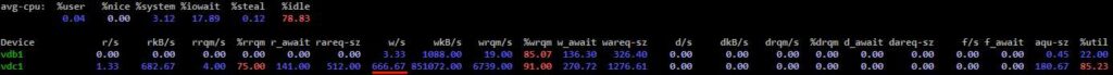 - 쓰기 시 캐시 디스크(vdc1)의 w/s 값이 올라가는 것을 확인 하실 수 있습니다.